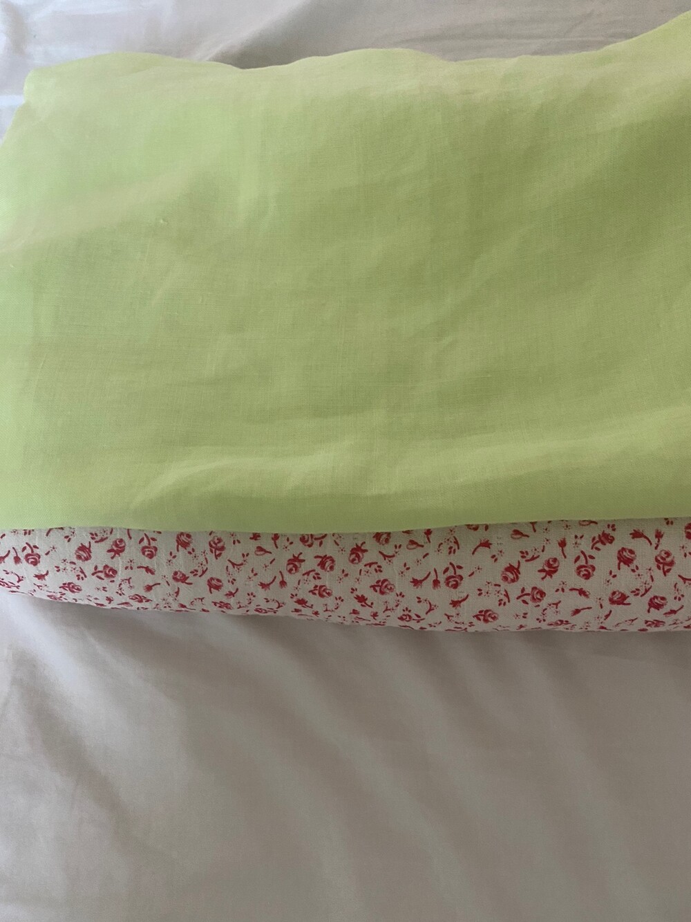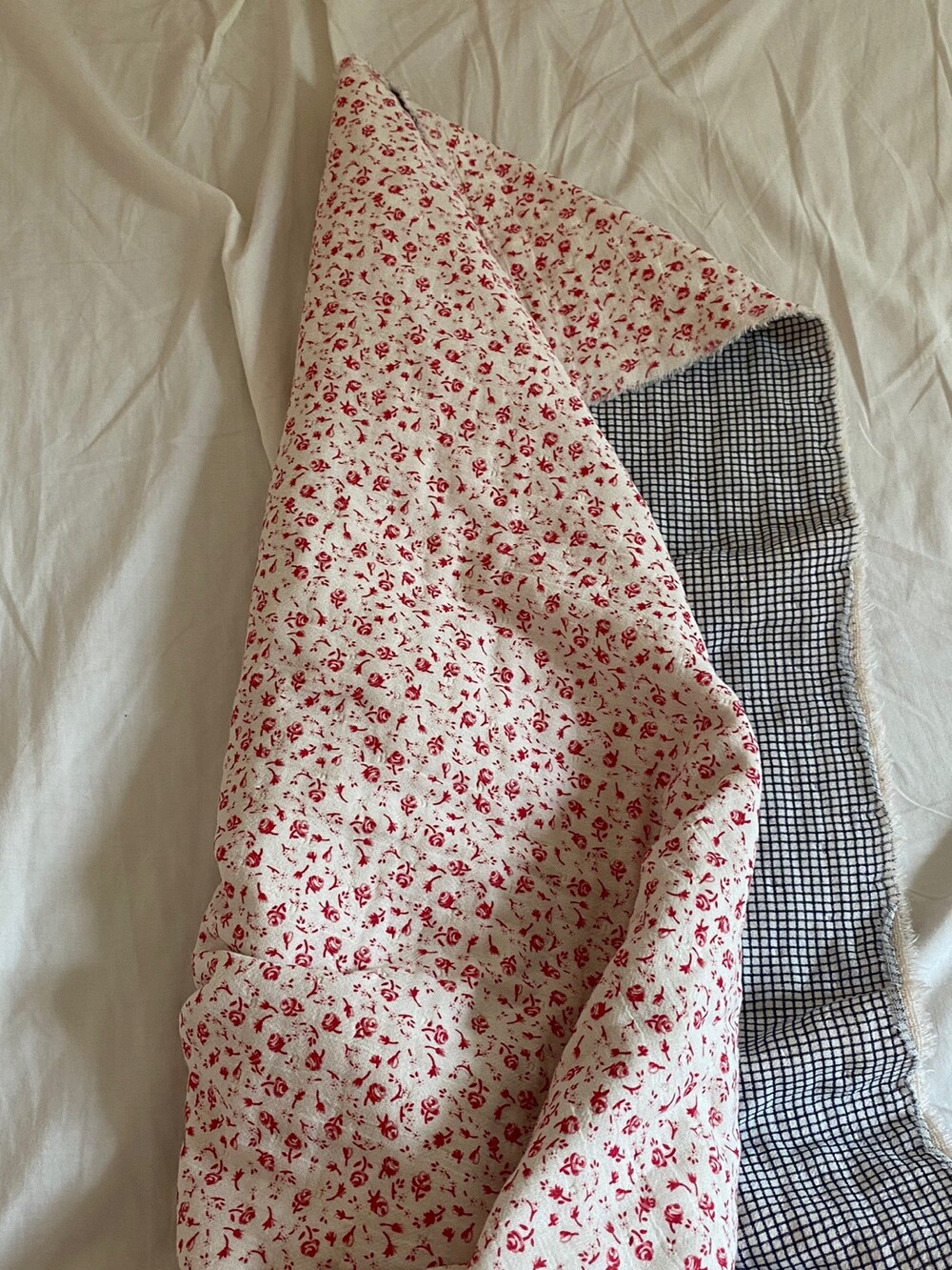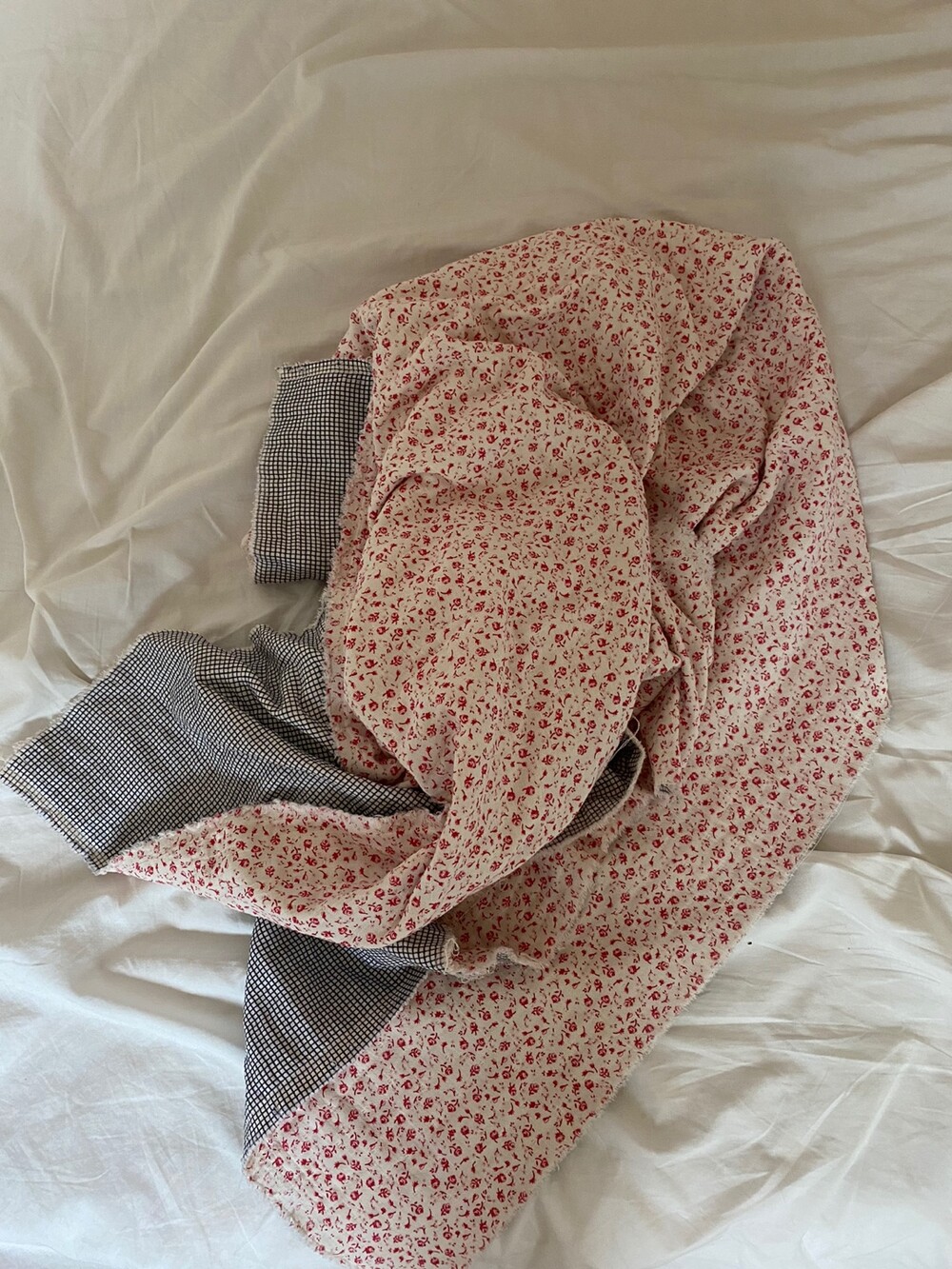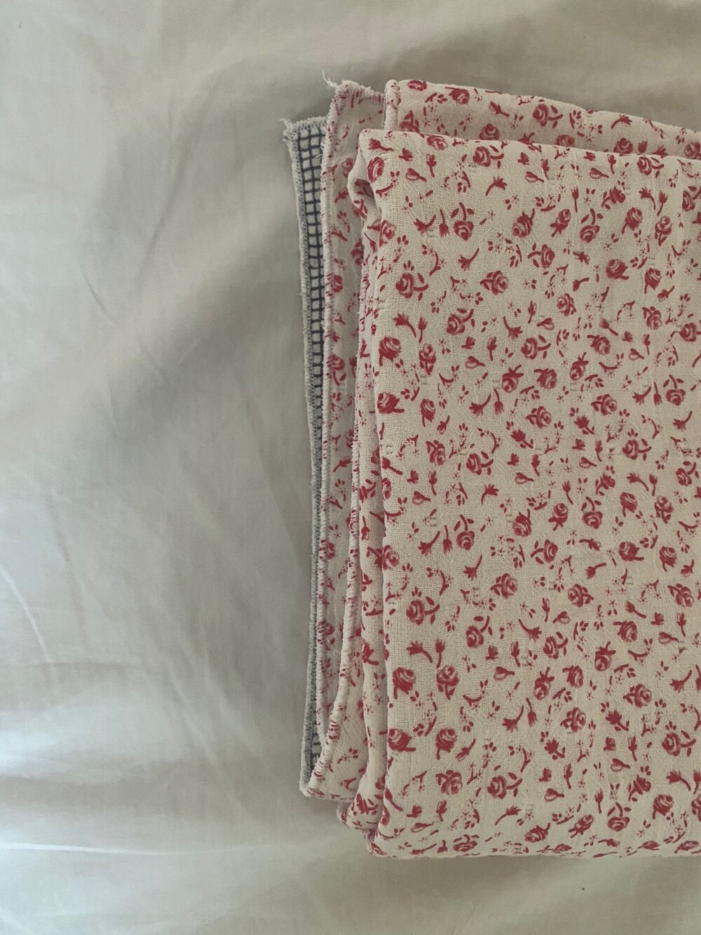 4중 거즈로, 봄가을용 원단이에요. 두께가 있고 약간 까슬거리는 재질.