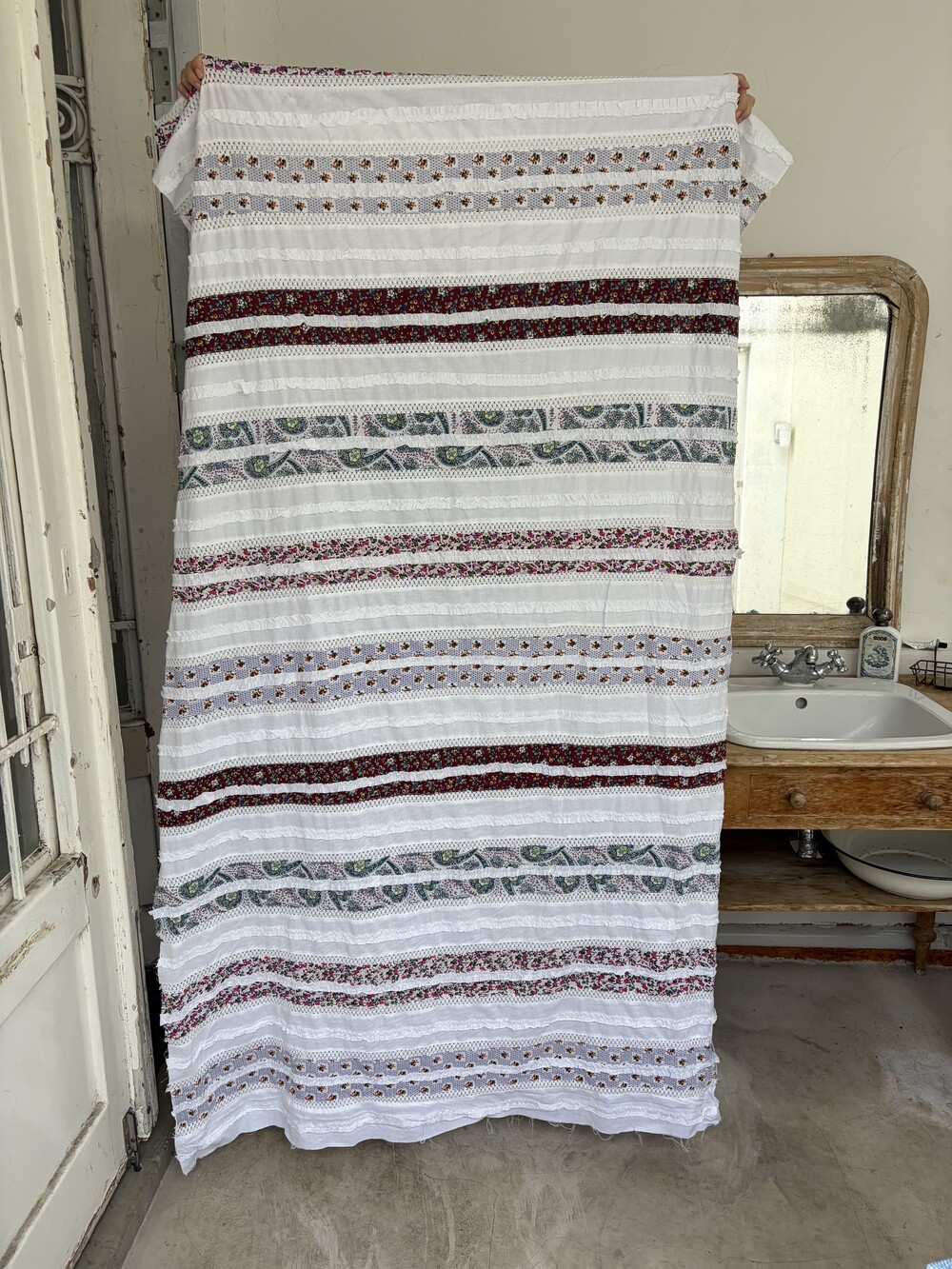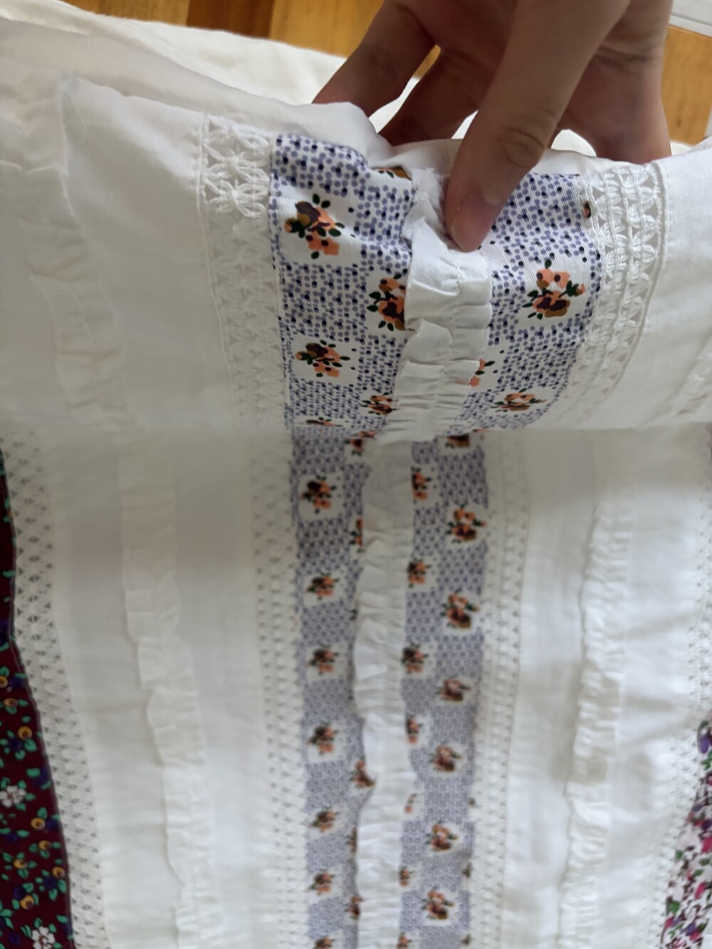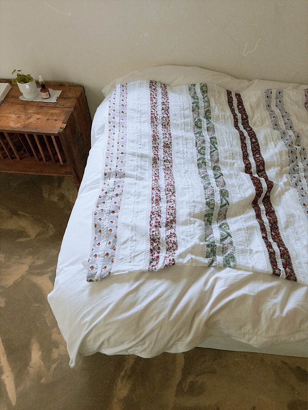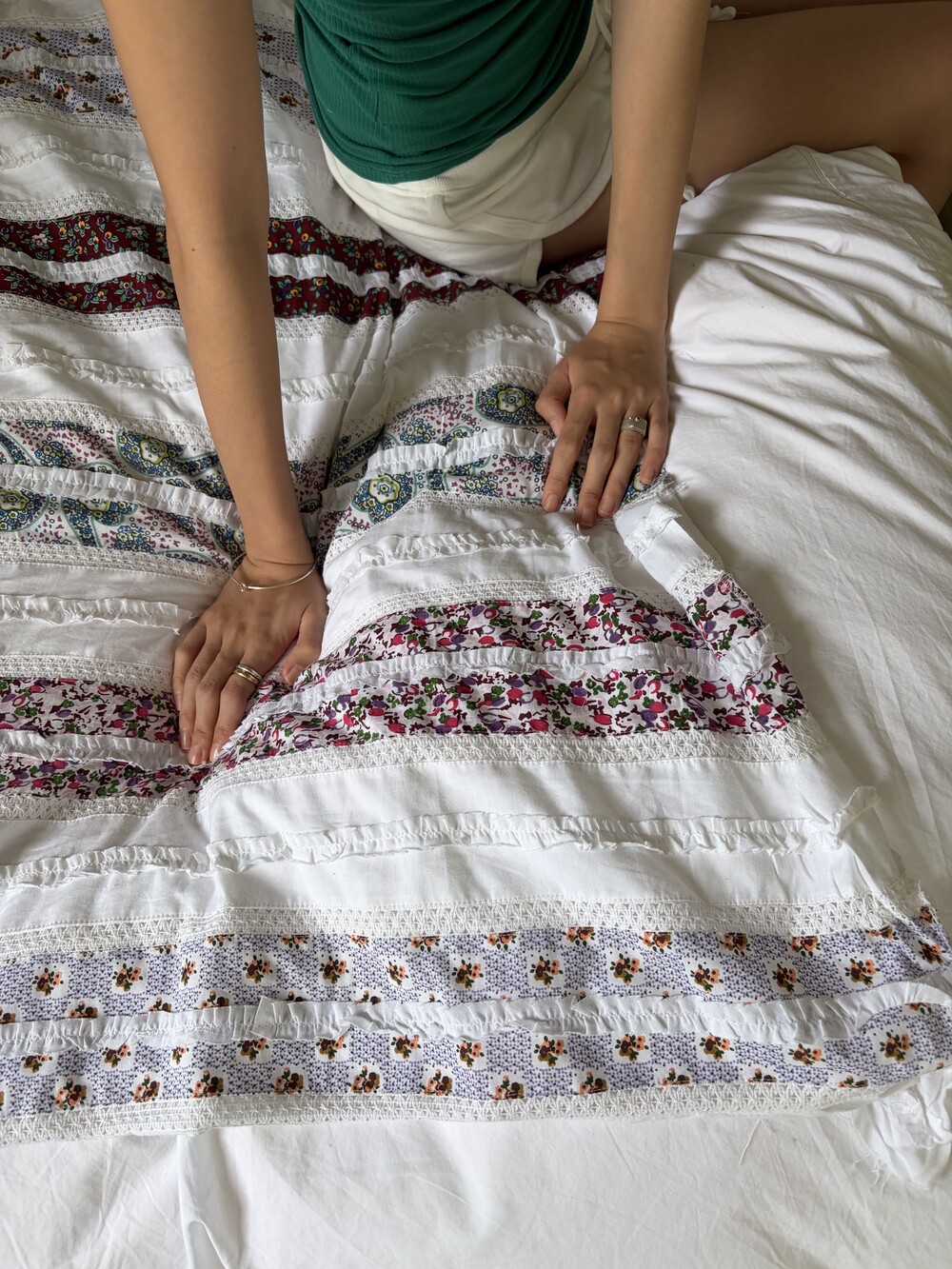 페이즐리, 잔꽃, 잔잔한 도트가 섞인 패치워크 이불이에요.
