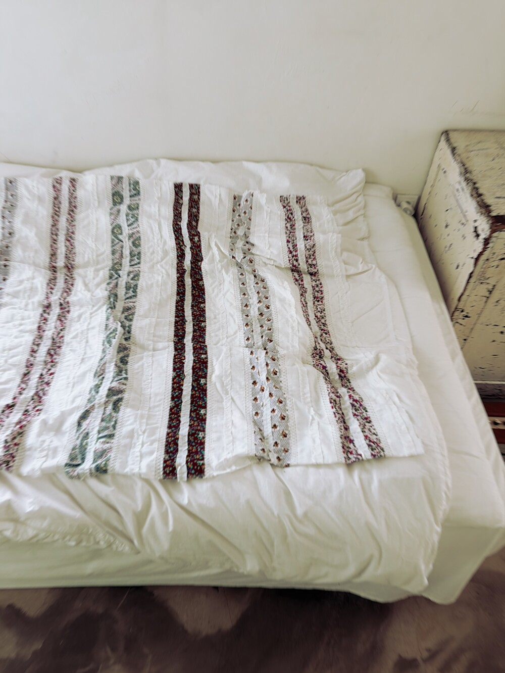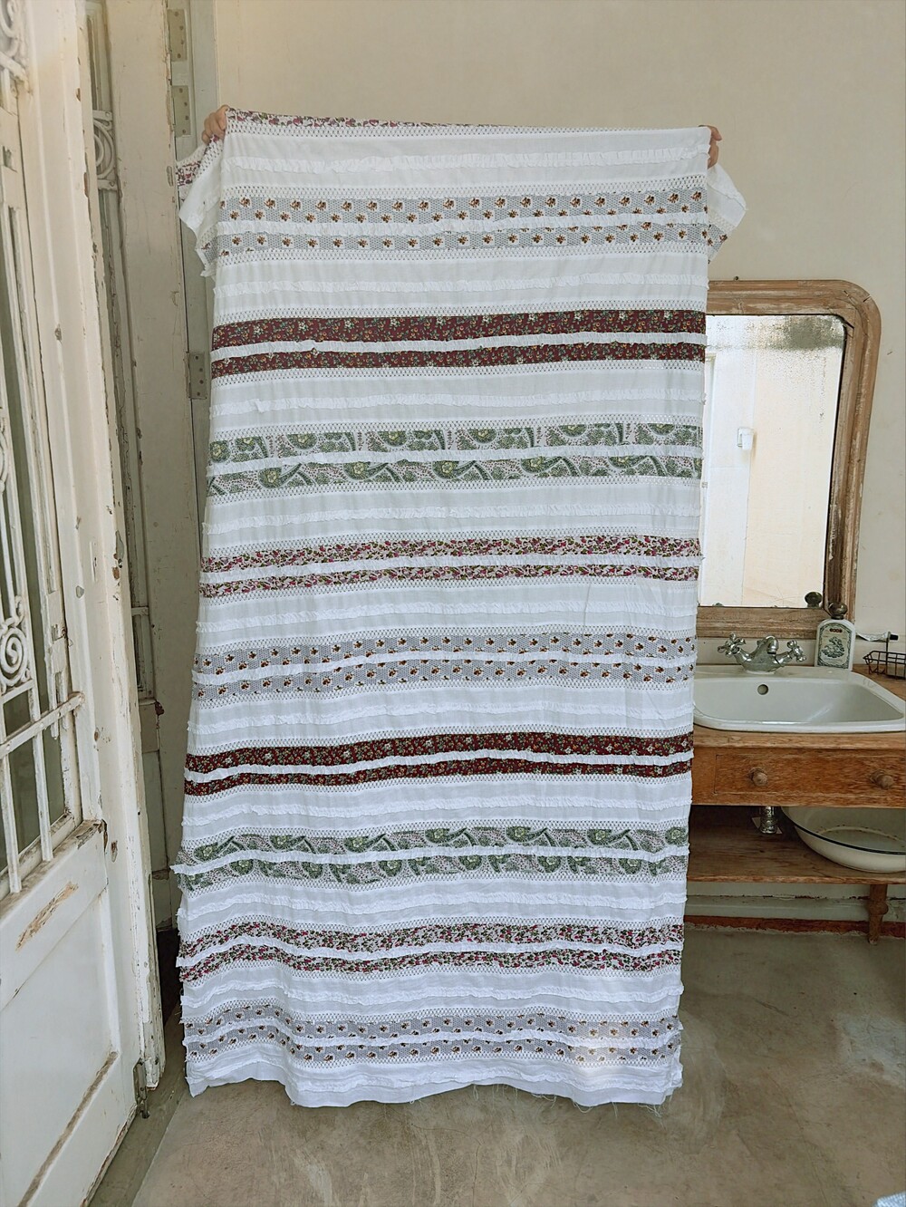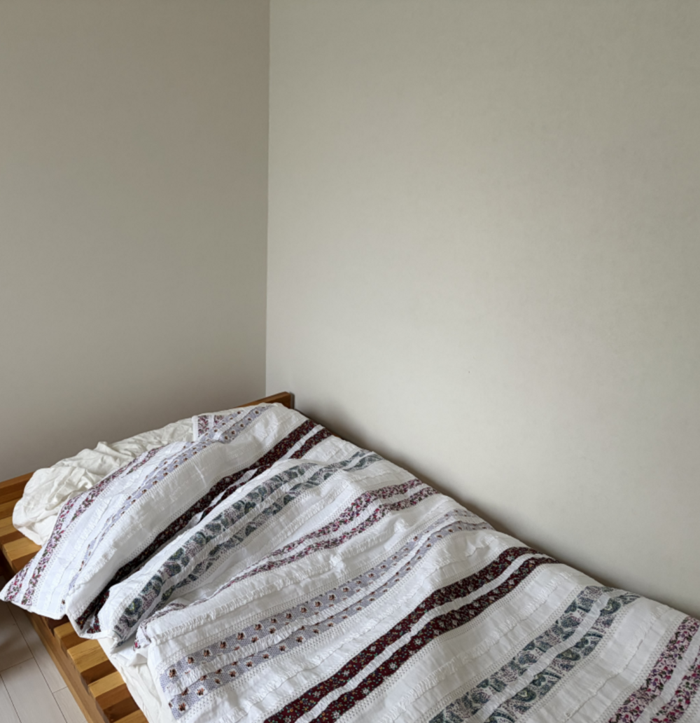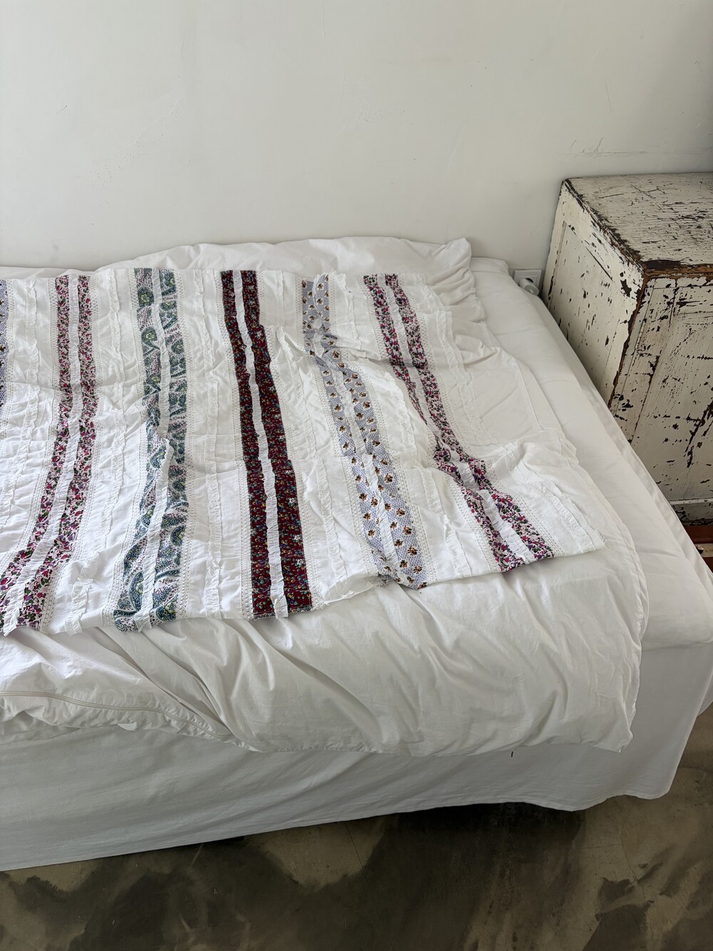 페이즐리, 잔꽃, 잔잔한 도트가 섞인 패치워크 이불이에요.
