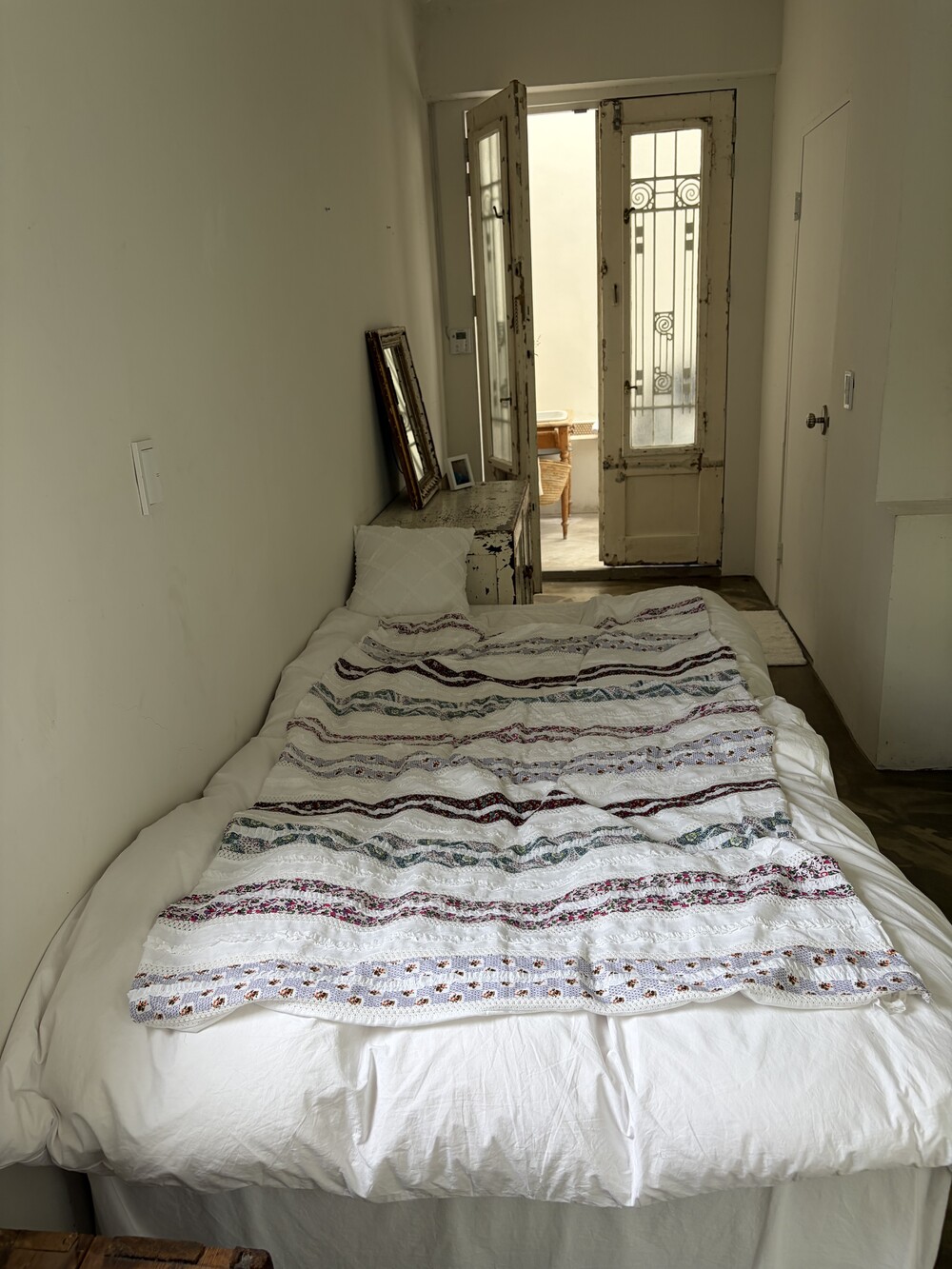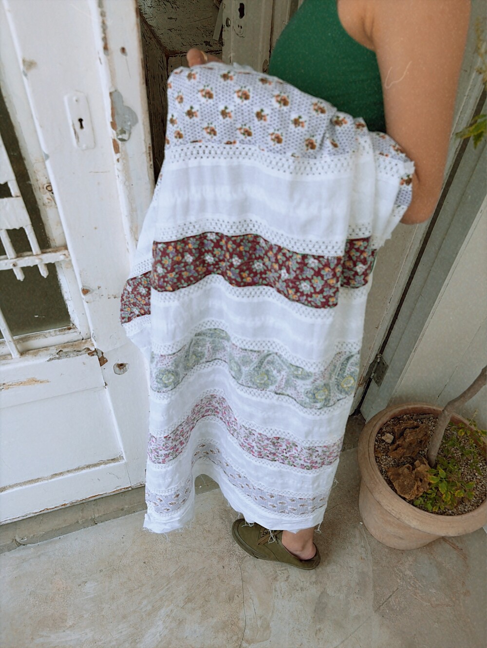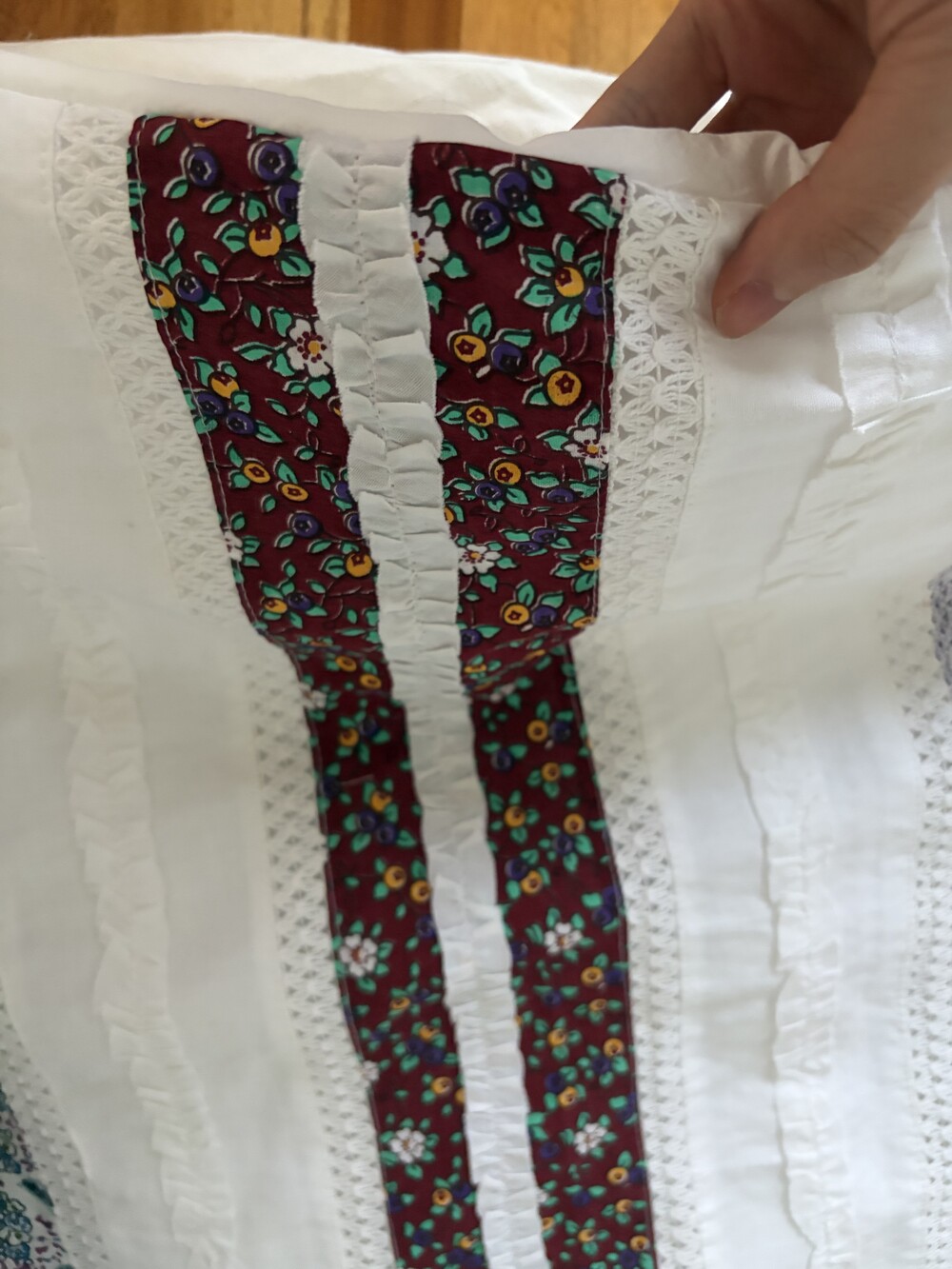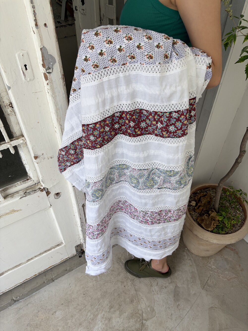 페이즐리, 잔꽃, 잔잔한 도트가 섞인 패치워크 이불이에요.
